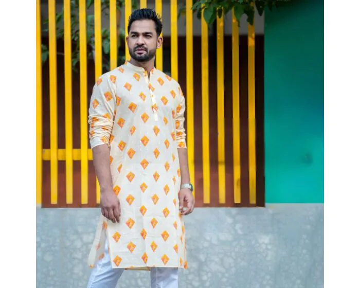 The Golden Ember Cotton Panjabi blends classic sophistication with a modern ethnic touch. Its golden-orange geometric motifs on a soft ivory base create a striking yet elegant look. The premium cotton fabric ensures comfort and breathability, making it ideal for daytime events, family gatherings, and cultural celebrations. Pair it with white pajama or pants and traditional sandals for a complete festive ensemble.