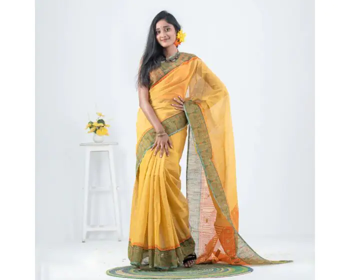 The sari has a rich golden yellow color, exuding a warm and joyful energy. The green and orange border complements the yellow, creating a beautiful contrast with delicate weaving.