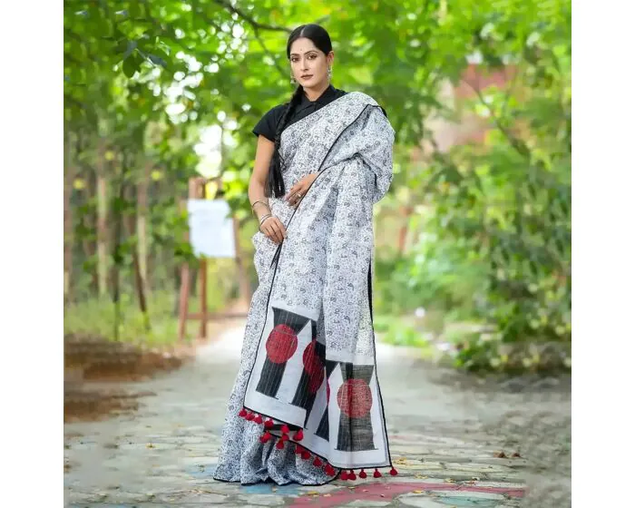 The Monochrome Symphony Handwoven Saree is an artistic fusion of traditional patterns and modern geometry. The black and white contrast with bold red details makes it an excellent choice for cultural events, casual gatherings, or even formal occasions. Its lightweight cotton fabric ensures all-day comfort, while the elegant tassels and structured pallu design add a contemporary flair. Pair it with silver or oxidized jewelry and a black blouse for a refined, confident look.