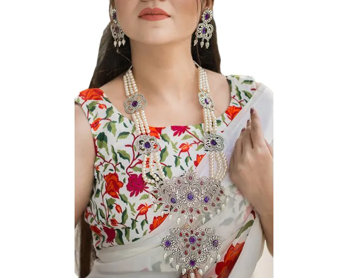 - Gemstones: Purple amethyst-colored stones, complemented by elegant white pearls.