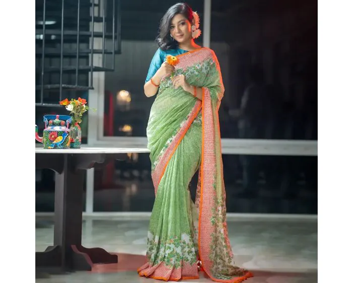 The Serene Meadow Handwoven Saree is a graceful fusion of nature-inspired hues and delicate artistry. The flowing pastel green fabric, adorned with floral motifs, evokes a fresh and elegant look, while the bold orange border adds a striking contrast. Perfect for festivals, cultural occasions, or elegant gatherings, this saree pairs beautifully with minimal jewelry and soft-toned accessories. Make a statement in ethnic sophistication with this exquisite piece!